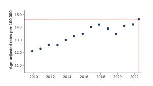 In 2023, the suicide rate in the United States hit 14.7 (per 100,000 individuals), matching 2018 as the highest suicide rate since 1941.